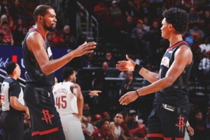 赛后火箭官方晒出本场赢球海报,杜兰特和阿门击掌瞬间登上封面。