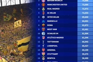 体育资讯12月29日讯 德转发布2025年欧洲俱乐部场均上座率排行,多特第一、拜仁第二、曼联第三。