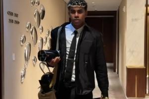 亚马尔获得的三项环足奖项分别是为最佳前锋奖(被亚马尔装在包里)、马拉多纳奖(颁给最有天赋的球员,亚马尔拿在左手)以及西甲最佳U23球员奖(亚马尔右手)。