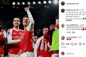 阿森纳中场梅里诺社媒晒出与进球功臣苏维门迪一起庆祝的照片,配文:“我们又收获3分!很棒的结果,继续加油!”