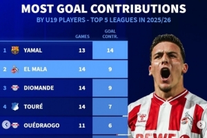体育资讯12月18日讯 《转会市场》统计了本赛季五大联赛U19球员直接参与进球榜,亚马尔无悬念领跑。