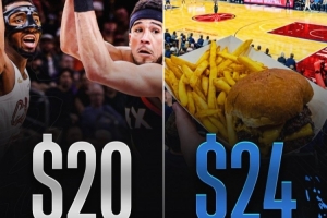 根据票务网站信息,本场比赛最低门票价格为20美元。而在球馆内,你点一个汉堡薯条组合都需要24美元。