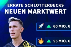 体育资讯12月18日讯 德国转会市场预热多特中卫施洛特贝克最新身价,最高可能达到6000万欧,最低4500万欧元。