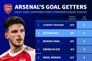 体育资讯1月4日讯 阿森纳在本轮英超3-2力克伯恩茅斯,赖斯双响建功,数据统计显示他也是本赛季英超队内参与进球最多的球员之一。