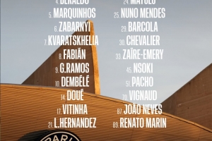 前锋:7-克瓦拉茨赫利亚、 9-贡萨洛·拉莫斯、10-登贝莱、14-杜埃、29-巴尔科拉