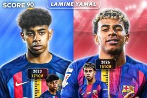 体育资讯01月04日讯 Score90晒图,展示了亚马尔从2023年到2026年的身高变化。