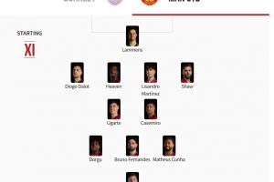曼联首发:31-拉门斯;23-卢克·肖、6-利桑德罗·马丁内斯、26-海文、2-达洛特;18-卡塞米罗、25-乌加特、8-B费;13-多尔古、10-库尼亚、30-舍什科