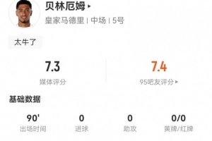 体育资讯1月9日讯 皇马在本轮西超杯对阵马竞,贝林厄姆本场数据如下: