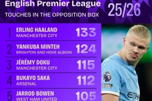 体育资讯1月10日讯 数据机构squawka统计了本赛季英超在对方禁区内触球情况,哈兰德领跑。