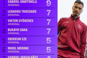 以下为本赛季各项赛事阿森纳球员进球榜: