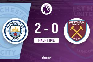 上半场补时2分钟,曼城2-0西汉姆。