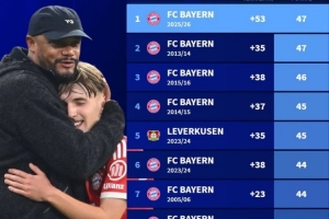 1、拜仁(25-26赛季),净胜球+53,积分47