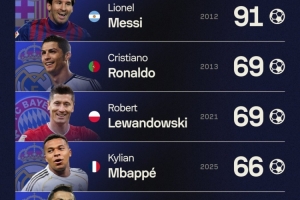 据Sofascore统计,姆巴佩2025年俱乐部+国家队总计打进66球,本世纪自然年进球第四多。
