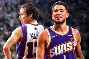 布克开场得到2分,他的生涯总得分来到17388分,超越队史名宿史蒂夫·纳什,上升至NBA历史第97位,他再得10分将超越武切维奇。
