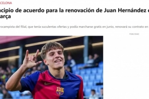 体育资讯1月21日讯 据《每日体育报》报道,巴萨即将和B队小将胡安·埃尔南德斯续约。预计在未来几天内双方将完成最后的手续,然后正式宣布续约的消息。