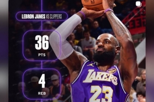 体育资讯12月21日讯 今日,湖人88-103客场不敌快船。本场比赛,湖人前锋詹姆斯上场37分钟,28投15中得到36分4篮板3助攻。
