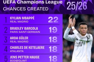 本赛季欧冠创造机会榜