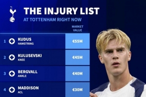 体育资讯1月23日讯 德国转会市场列出了热刺伤员的身价排名,库杜斯5500万欧居首,库卢塞夫斯基4500万欧次席。