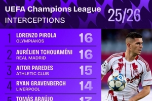 本赛季欧冠拦截排名: