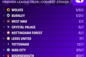 本赛季英超降级赔率排名: