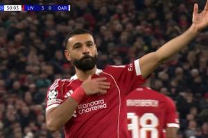 比赛第50分钟,利物浦任意球索博斯洛伊一踩,萨拉赫左脚轰出世界波,打进非洲杯结束归队后首球,拍胸口利物浦队徽庆祝!场上比分利物浦3-0卡拉巴赫。