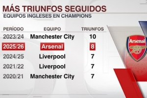 以下为英超球队在欧冠连胜纪录榜: