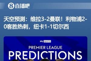 12月19日链接戳>>>天空预测:维拉3-2曼联!利物浦2-0客胜热刺,纽卡1-1切尔西