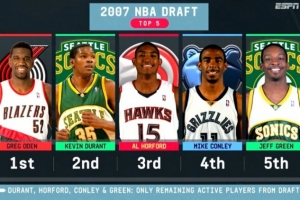 目前2007年只剩下4人在打NBA,首轮前五顺位除奥登外,杜兰特、霍福德、康利和杰夫·格林仍在赛场驰骋