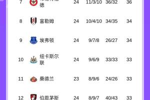 体育资讯2月2日讯 英超第24轮,热刺2-2战平曼城,最新的积分榜情况如下↓