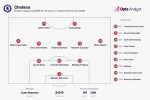 体育资讯2月4日讯 联赛杯半决赛次回合比赛,切尔西前往客场挑战阿森纳。赛前首发阵容显示,切尔西本场比赛采用了三后卫阵型。