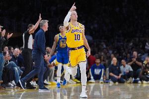 体育资讯2月8日讯 NBA常规赛,湖人半场41-42落后勇士。