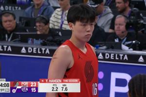 这球裁判吹科迪威犯规,爵士挑战,挑战成功!改成森萨博犯规,杨瀚森依旧获得两罚!并且两罚全中。