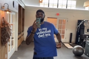 詹姆斯今日身穿一件印有“我担当排球父亲的时代”字样的T恤,并配文道:“致敬我的👸🏾@Zhuri 🤎🤎✨✨✨🏐”