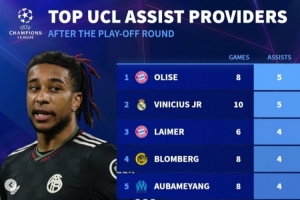 体育资讯2月26日讯 欧冠淘汰赛附加赛已经完赛,《转会市场》也统计了本赛季欧冠助攻榜,奥利塞、维尼修斯各5次。