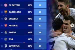体育资讯2月27日讯 本赛季欧冠淘汰赛抽签在即,德转也盘点了欧冠自03/04赛季改革赛制之后,各支球队晋级16强次数榜,具体如下(晋级成功率+次数):