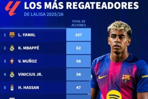 体育资讯2月27日讯 巴萨天才亚马尔的盘带技术是球队破解对手密集防守的利器。据西甲官方数据统计,2025/26赛季西甲过人次数排行榜单中,亚马尔以107次断层领先。