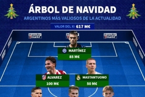 体育资讯12月25日讯 圣诞节之际,德国转会市场排出了阿根廷身价最高圣诞树阵容,劳塔罗、阿尔瓦雷斯、恩佐、麦卡利斯特在列。