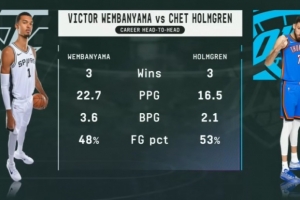 据统计,文班亚马和霍姆格伦生涯至今交手6次,双方各取3胜。