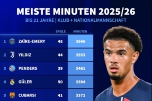 附五大联赛U21球员出场时间榜: