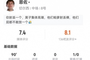 体育资讯12月28日讯 切尔西在本轮英超1-2被维拉逆转,恩佐本场数据如下: